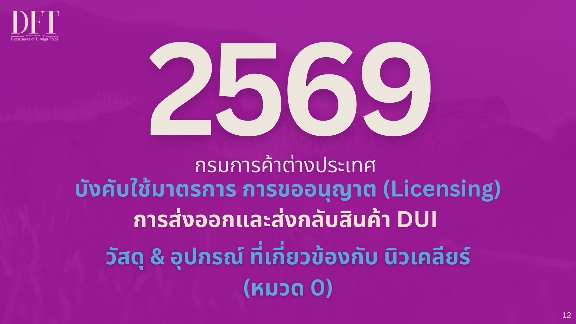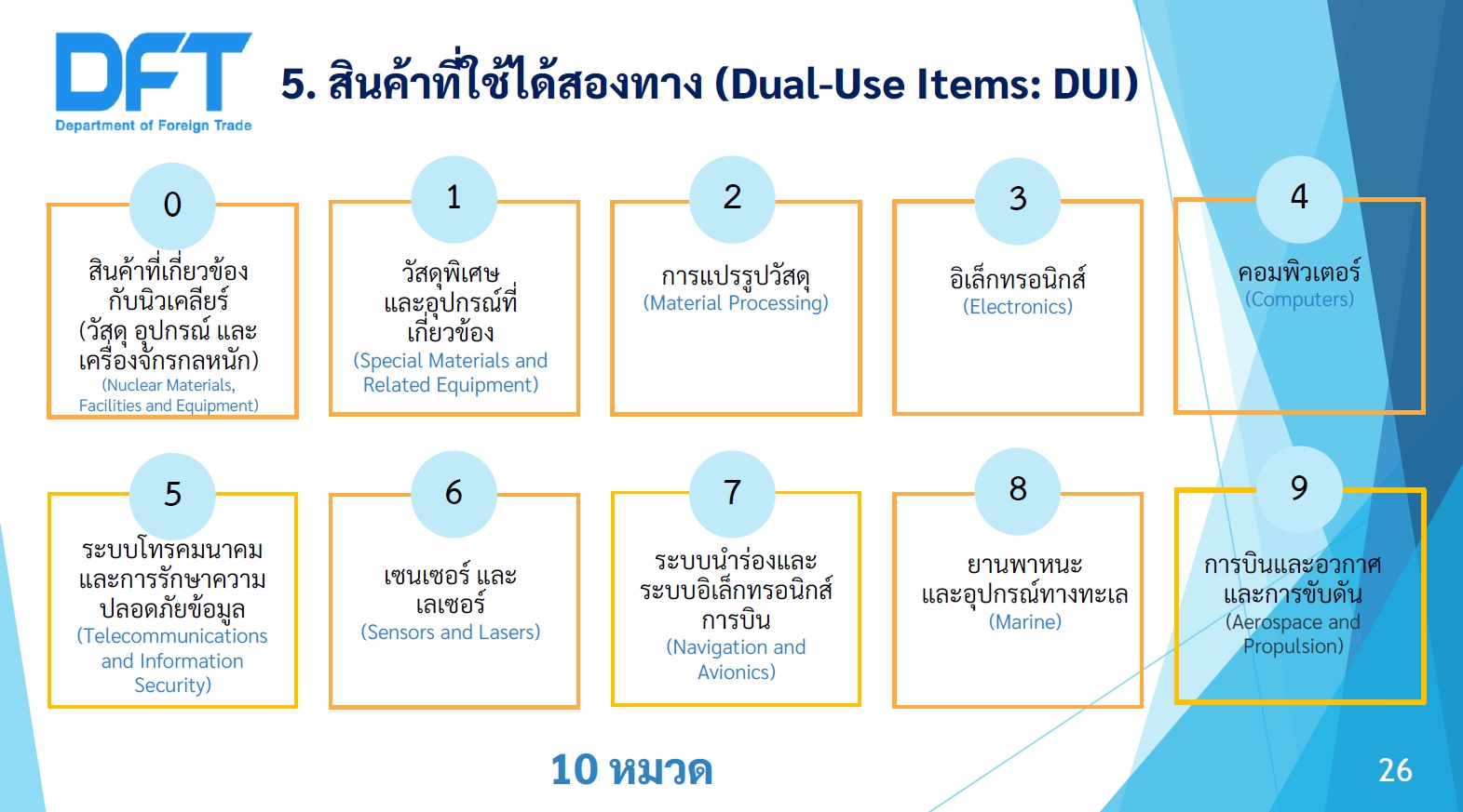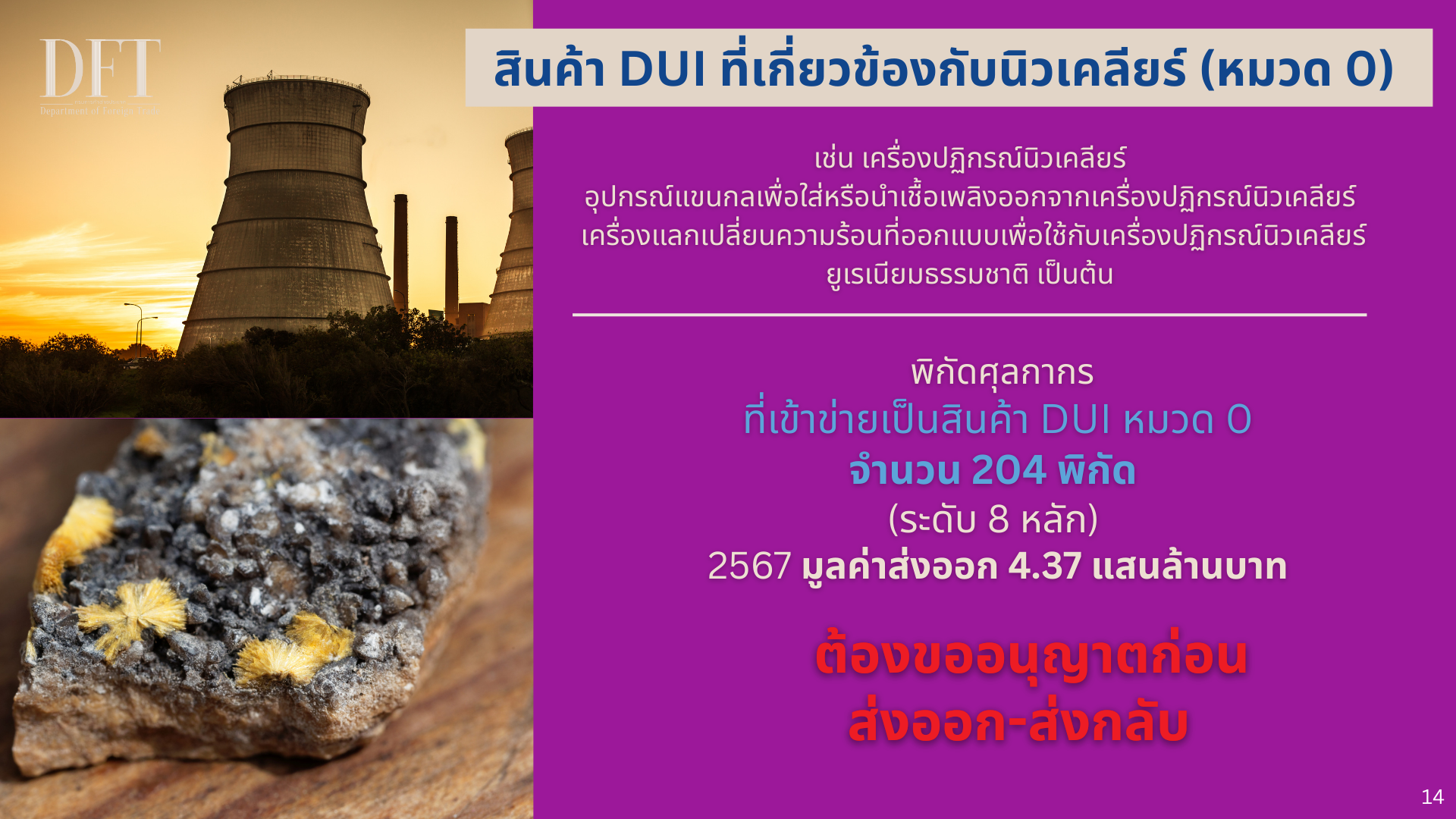 • ความคืบหน้าของมาตรการ Phase 1: กรมการค้าต่างประเทศ เน้นให้ความสำคัญการควบคุมสินค้ากลุ่มแรก (หมวด 0 สินค้าที่เกี่ยวข้องกับนิวเคลียร์ (วัสดุ อุปกรณ์ และเครื่องจักรกลหนัก) (Nuclear Materials, Facilities and Equipment)) ที่เข้าข่ายเป็นสินค้า DUI โดยผู้ประกอบการต้องตรวจสอบข้อมูลสินค้าของตนเอง