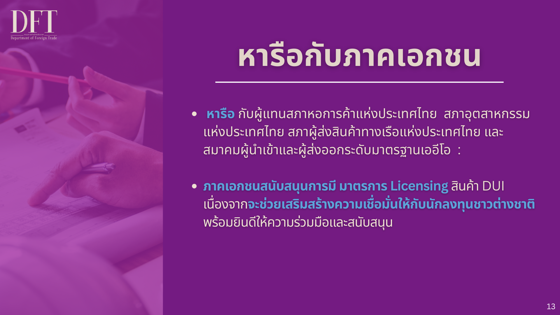 • แผนการพัฒนาในอนาคต: ในระยะต่อไป กรมการค้าต่าวประเทศ จะขยายการควบคุมไปยังสินค้าในหมวดอื่นๆ เพิ่มเติมตามกรอบระยะเวลาที่กำหนดไว้ใน Phase 1 และ 2 อีกทั้งเตรียมพิจารณารูปแบบออกใบอนุญาตแบบรายปี (Bulk Licensing) สำหรับบริษัทที่มีการส่งออกสินค้า DUI และสินค้าที่เข้าข่ายแต่ไม่เป็น DUI ต่อเนื่อง