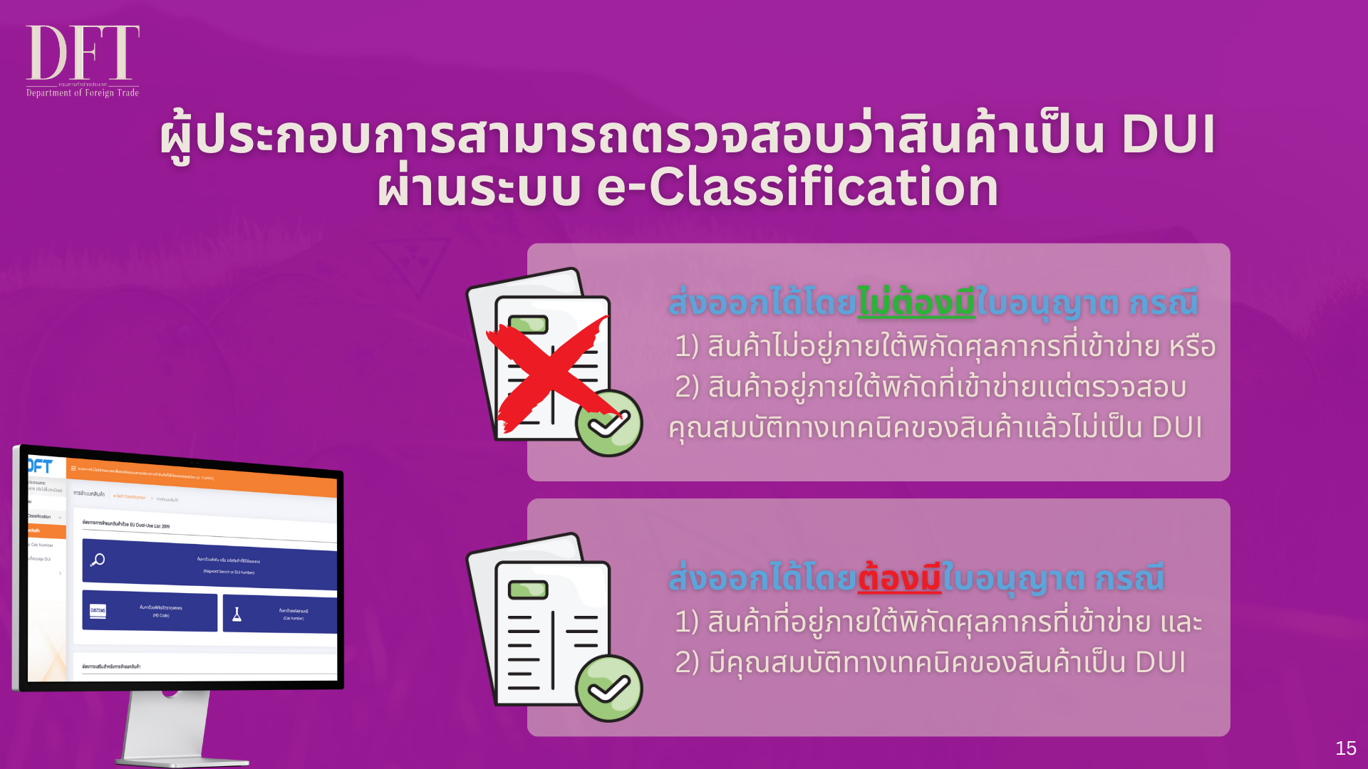 ตรวจสอบสินค้าของคุณ: ผู้ส่งออกสามารถตรวจสอบรายการสินค้าของตนเองได้ว่าอยู่ในพิกัดศุลกากรที่เข้าข่าย DUI หรือไม่ โดยไม่ต้องลงทะเบียน ที่ https://tcwmd.dft.go.th/etcwmd_iii/classification/main