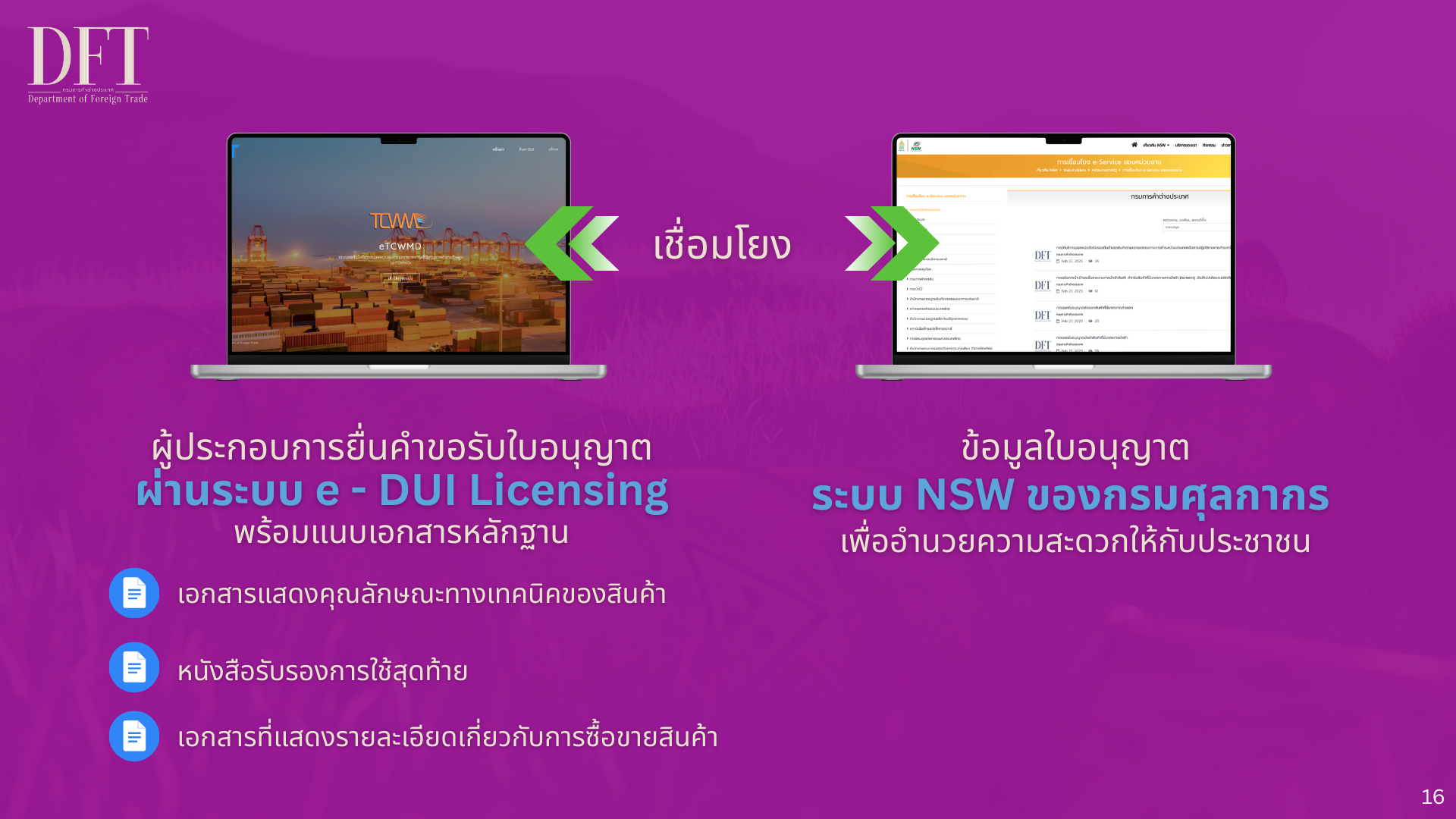 • การอำนวยความสะดวก: กรมการค้าต่างประเทศ ได้พัฒนาให้ระบบ e-Licensing เชื่อมต่อกับระบบ NSW แล้ว และวางแผนจัด Roadshow ทั่วประเทศ เพื่อให้ความรู้และทำความเข้าใจกับผู้ประกอบการเกี่ยวกับขั้นตอนและข้อกำหนดทางกฎหมาย