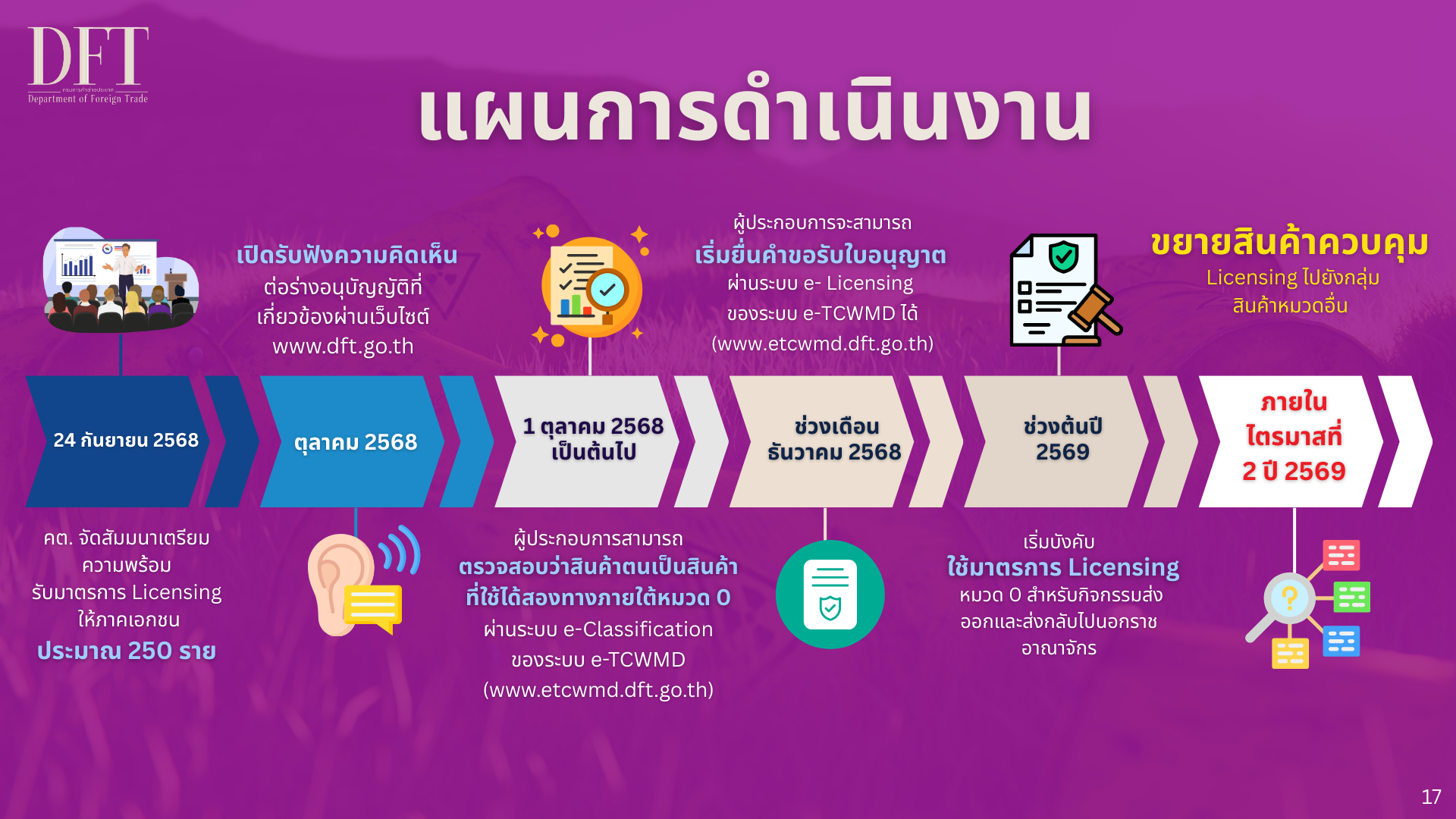 • แผนการบังคับใช้จริง: กฎหมายฉบับใหม่คาดว่าจะประกาศใช้และระบบ e-TCWMD จะเปิดให้ใช้งานจริงในช่วง กลางเดือนมกราคม 2569 จะเริ่มต้นเฉพาะกลุ่มสินค้าในหมวด 0 (สินค้าที่เกี่ยวข้องกับนิวเคลียร์ (วัสดุ อุปกรณ์ และเครื่องจักรกลหนัก) (Nuclear Materials, Facilities and Equipment)) ก่อน โดยผู้ประกอบการสามารถเริ่มลงทะเบียนเพื่อแสดงตัวตนผ่านระบบ DFT Smart I ได้ตั้งแต่วันที่ 1 ธันวาคม 2568 เป็นต้นไป