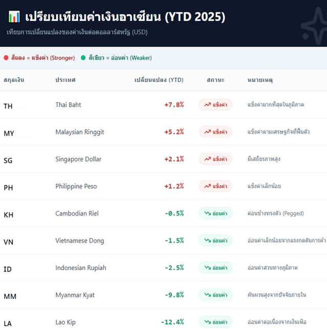 กลุ่มที่มีแนวโน้มแข็งค่า อาทิ มาเลเซีย แข็งค่าร้อยละ +5.2 จากแรงหนุนจากราคาสินค้าโภคภัณฑ์ที่ยังอยู่ในระดับสูง และความเชื่อมั่นของนักลงทุนที่เพิ่มขึ้นจากการปฏิรูปเศรษฐกิจ แนวโน้มยังคงเป็นบวก แต่ต้องระวังความผันผวนตามราคาน้ำมันและก๊าซ, สิงคโปร์ แข็งค่าขึ้นร้อยละ +2.1 ซึ่งถือเป็นสกุลเงินที่ค่อนข้างปลอดภัย (Safe Haven) ของภูมิภาค นโยบายการเงินที่เข้มงวดช่วยรักษามูลค่าของ SGD ให้แข็งแกร่งอย่างต่อเนื่อง ขณะที่ ฟิลิปปินส์ แข็งค่าขึ้นร้อยละ +1.2 แข็งค่าขึ้นไม่มาก แต่ได้รับแรงสนับสนุนจากเงินโอนกลับเข้าประเทศของแรงงานที่ออกไปทำงานต่าง รวมถึงภาคธุรกิจ