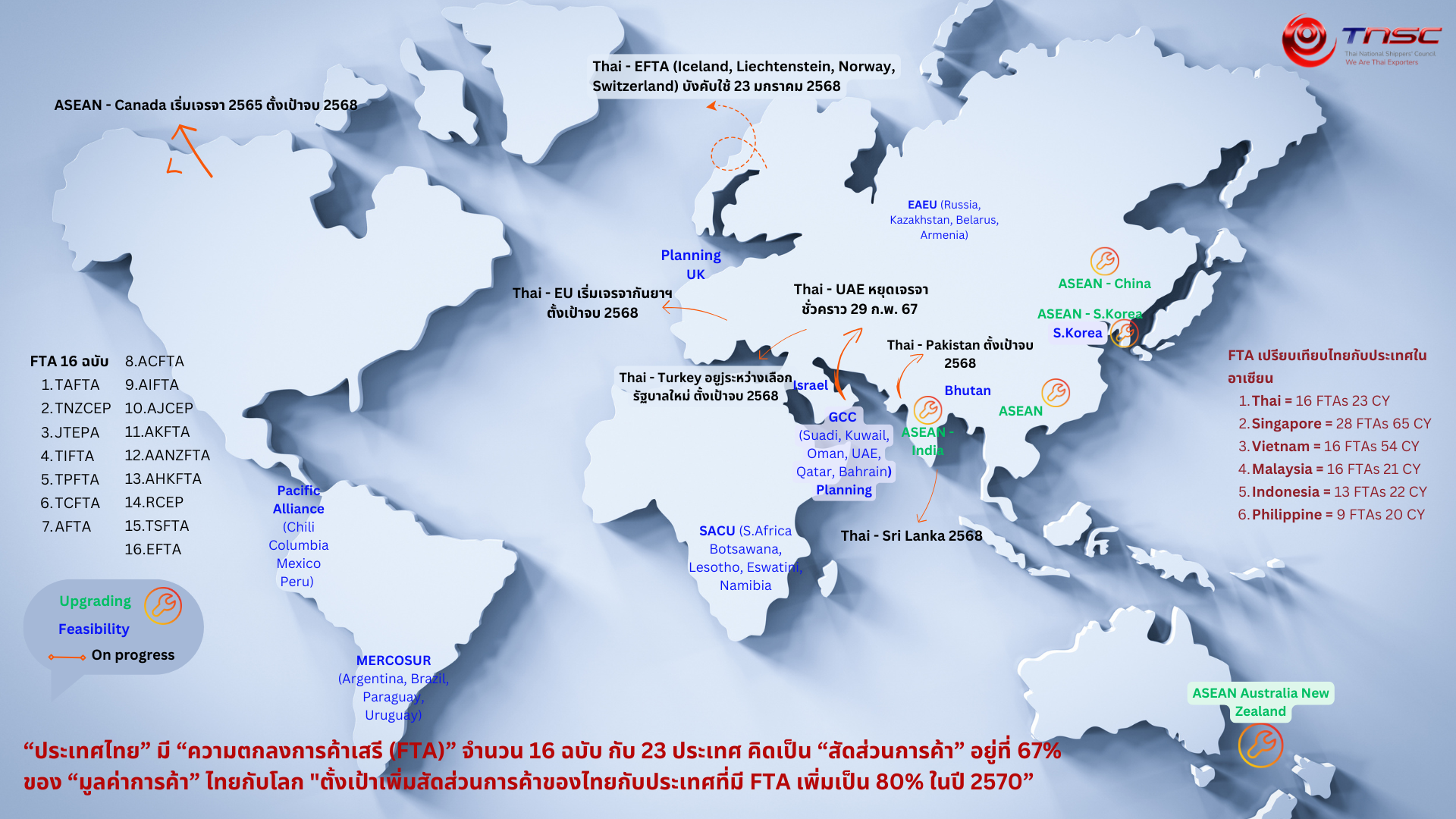 | FTA ที่มีผลใช้บังคับแล้ว (14 ฉบับ) | อาเซียน (AFTA), อาเซียน-จีน (ACFTA), อาเซียน-อินเดีย (AIFTA), อาเซียน-ญี่ปุ่น (AJCEP), อาเซียน-เกาหลี (AKFTA), อาเซียน-ออสเตรเลีย-นิวซีแลนด์ (AANZFTA), อาเซียน-ฮ่องกง (AHKFTA), ไทย-ออสเตรเลีย (TAFTA), ไทย-นิวซีแลนด์ (TNZCEP), ไทย-ญี่ปุ่น (JTEPA), ไทย-อินเดีย (TIFTA), ไทย-เปรู (TPFTA), ไทย-ชิลี (TCFTA), หุ้นส่วนทางเศรษฐกิจระดับภูมิภาค (RCEP)