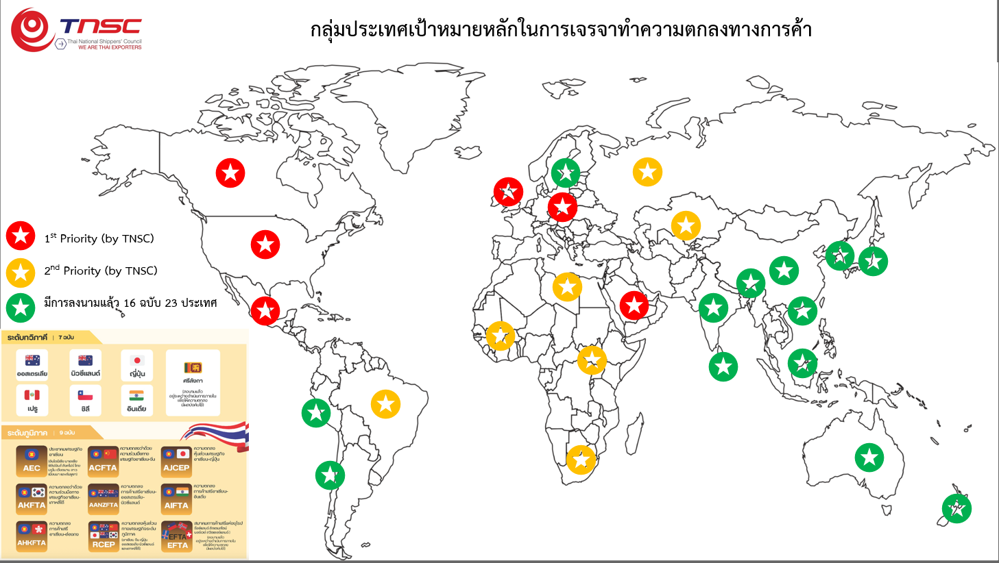 • ตั้งเป้าเจรจาให้แล้วเสร็จภายในปี 2569 คือ Thai – EU ASEAN – Canada และ Thai – South Korea และเร่งรัดให้ FTA ไทย - EFTA ให้มีผลใช้บังคับครึ่งปีแรก ปี 2569 (ข้อตกลงที่เสร็จสมบูรณ์แล้วในเอกสารหลักของ ความตกลงการค้าเสรีระหว่างรัฐสมาชิกสมาคมการค้าเสรีแห่งยุโรป (EFTA) และราชอาณาจักรไทย (EFTA-Thailand Free Trade Agreement) หมายถึง ทุกข้อบท (Chapters) ที่บรรจุอยู่ในเอกสาร ซึ่งคู่ภาคี (EFTA States และ ราชอาณาจักรไทย) ได้ "ตกลงร่วมกัน" (HAVE AGREED) ที่จะจัดทำความตกลงการค้าเสรี)